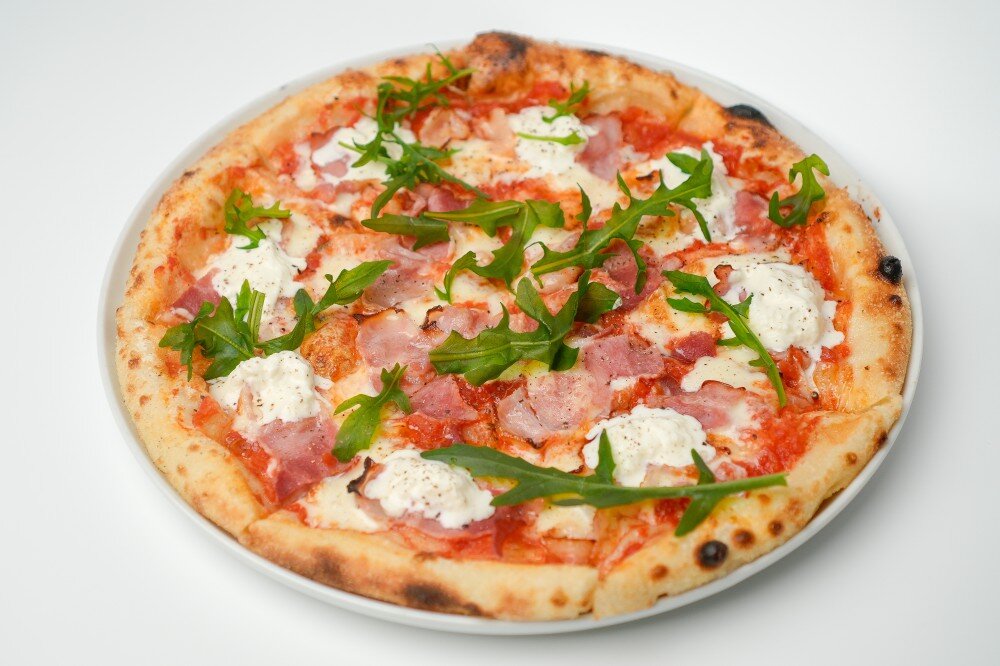 Соус томатный, сыр моцарелла, бекон, сыр страчателла.