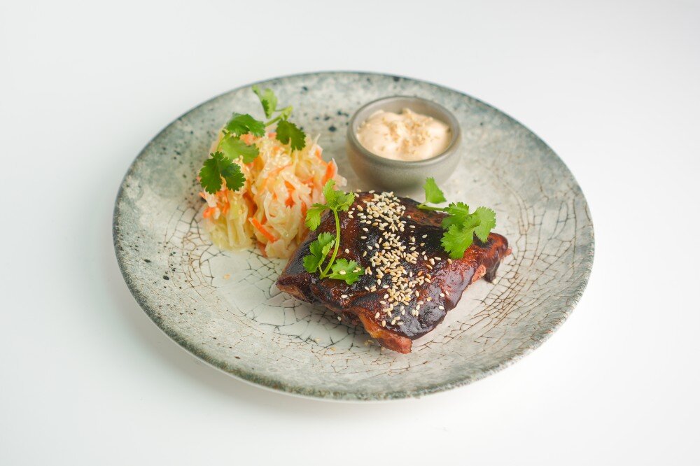Свиные ребра, глазурь мед, салат коул слоу, кунжут, соус айоли шрирача.